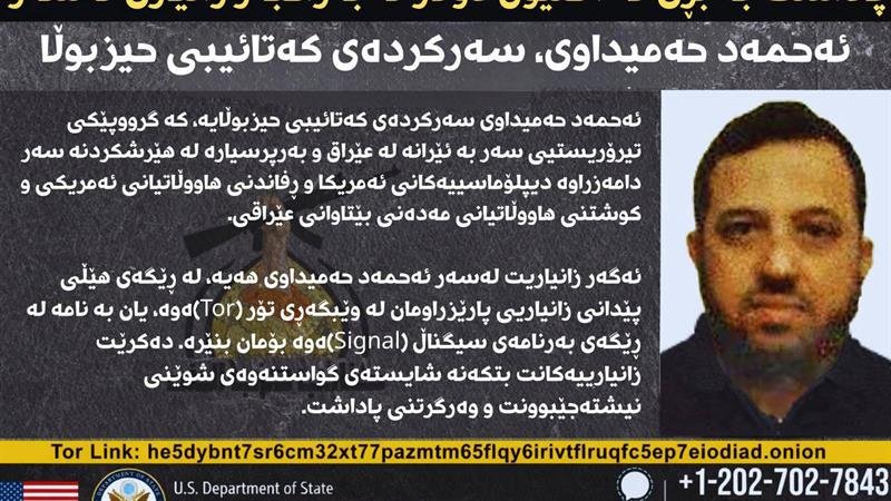 ئەمریکا پەیامێک ئاراستەی عێراقییەکان دەکات و دەڵێت،” ئەگەر زانیاریت لەسەر ئەحمەد حەمیداوی هەیە، لە ڕێگەی هێڵی پێدانی زانیاریی پارێزراومان لە وێبگەڕی تۆر(Tor)، یان بە نامە لە ڕێگەی بەرنامەی سیگناڵ (Signal)ەوە بۆمان بنێرە”.