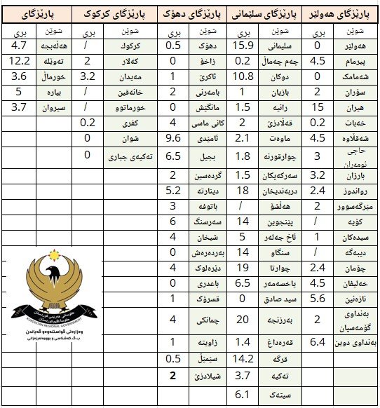 بڕی باران لە ناوچەكانی دیكەی هەرێمی کوردستان بەمجۆرەیە: