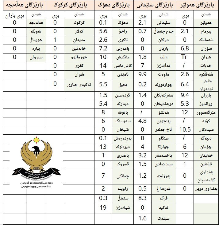 بڕی باران لە ناوچەكانی دیكەی هەرێمی کوردستان بەمجۆرەیە: